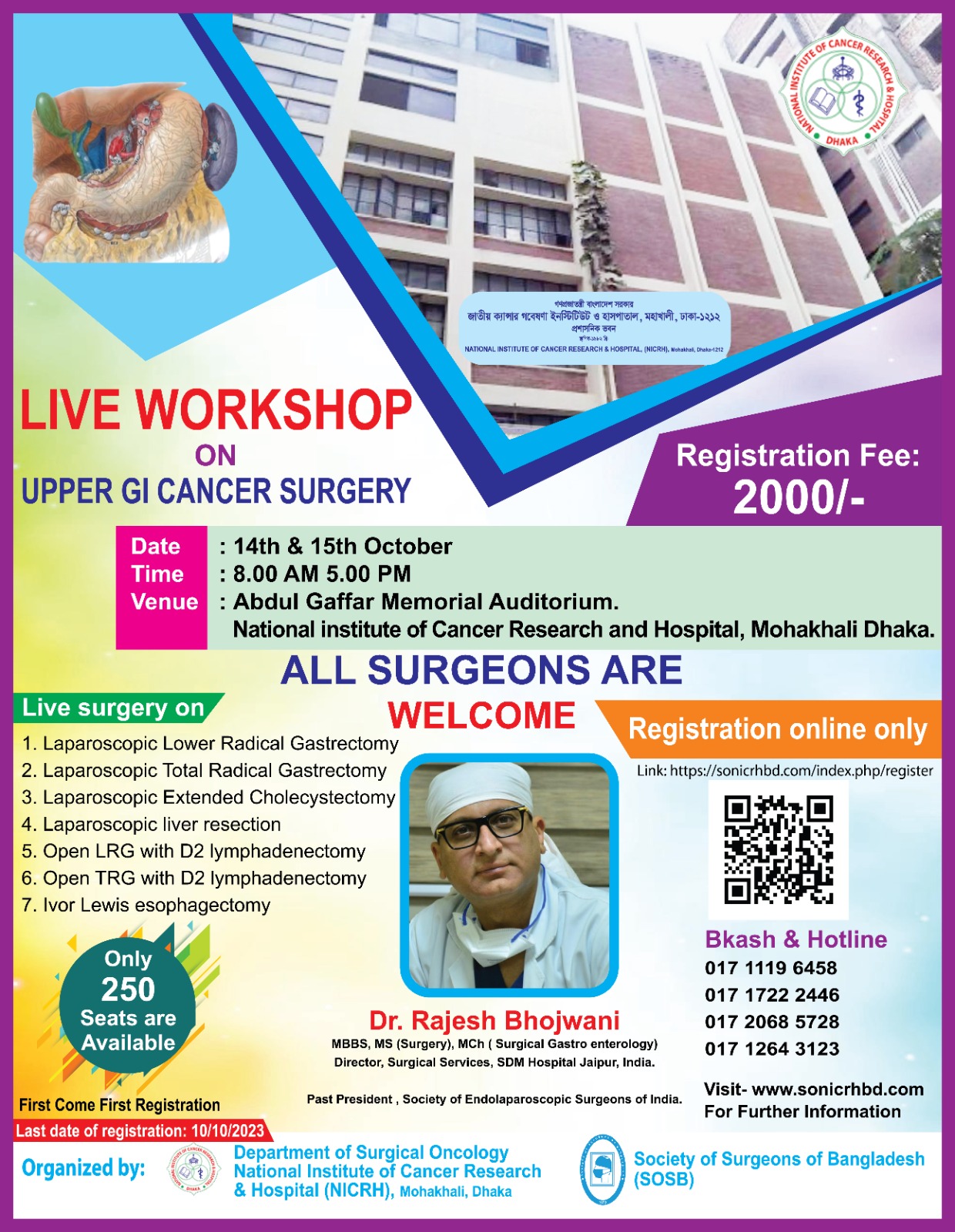 The department of surgical oncology is one of the most important division in the National Institute of Cancer Research and Hospital (NICRH), Dhaka, Bangladesh. It provides surgical inputs in the multidisciplinary management of cancers and performing ablation of solid tumour. Surgery remains the best modality, either by itself or in combination with adjuvant treatment of solid cancers. In our hospital this department provides surgical oncology OPD, diagnostic procedure and services as Endoscopy, Colonoscopy and various biopsy procedures and curative as well as palliative surgical procedures for a wide array of cancers with a team of experts and experienced skilled surgeons. The Divisionof Surgical Oncology offers a comprehensive approach involving specialiazed care cancer research related treatment of malignant tumours. There’s an emphasis on research where our surgical oncologist engage in basic science and clinical studies of cancer prevention, experimental treatments, Molecular therapy and immunogenetic study. In addition there is Master in Surgery( MS) Residency course on Surgical oncology under supervision of BSMMU, Dhaka, Bangladesh. The vast experiences over 1000 major and 7500 minor surgical procedures every year has brought an unmatched excellence to the department. In addition to being pioneer in the field of surgical oncology in Bangladesh has a strong clinical and research aptitud.